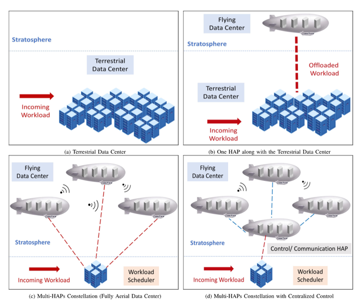 У 2023 році дослідники окреслили концепцію плаваючих ІТ-об'єктів, які можуть використовувати стратосферу для охолодження. Якщо перекласти частину наземних робочих навантажень на літаючий дата-центр, це може заощадити до 14% енергоспоживання.